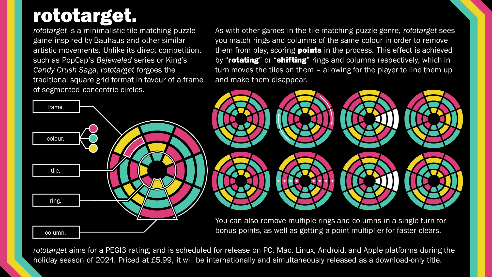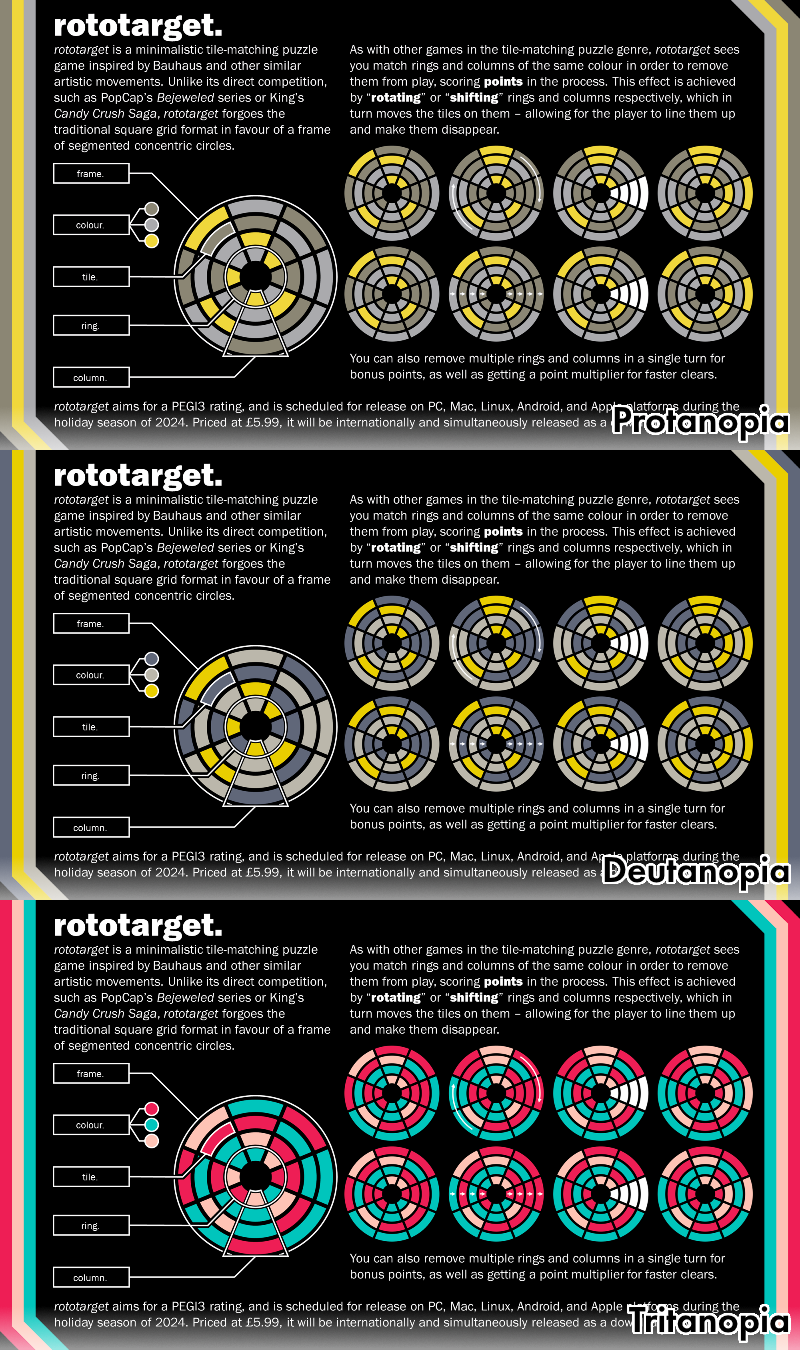 With that in mind, Rototarget was designed to kind of play into a similar concept of an unusual field of play for a tile-matching game. I'm fairly certain things like hexes have been done before, but the concept of segmented concentric circles came about because of something else. Specifically, I felt like it'd be a lot of fun to explore how one of those more unusual fields-of-play would actually work on a mechanical level. (Otherwise, why not just keep to what people are familiar with?) Hence, the rotating / shifting concept came about - being able to spin different rows and also shifting tiles up and down along their respective columns (a thought inspired by FUTURE MEMORY's CROSSNIQ+, which has a similar focus on a normal, grid-based sense.)